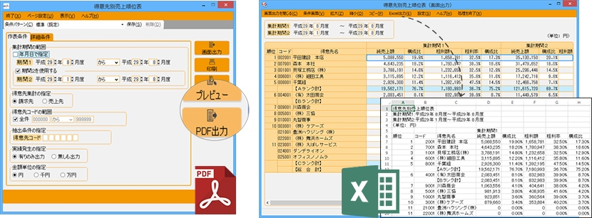 帳票から簡単に行えるPDF出力やExcel出力機能をさらに簡略化、必要な情報をすぐ入手できるから、データ利用の可能性が広がる!