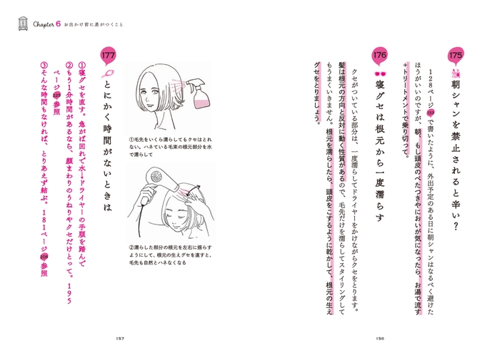 寝グセは根元から一度濡らす/女は分け目から老ける/ひし形が圧倒的に美人/後頭部を盛ると若く見える/ワックスは混ぜても使える etc.
