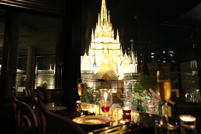 店内の全席からライトアップされた「青山セントグレース大聖堂」が望めるロマンティックな空間は、誕生日や記念日などの特別なデートにもおすすめ。期間限定のお得なショートディナーコースをお楽しみください。