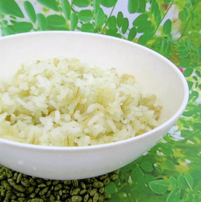 モリンガは一般植物の約20倍のCO2を吸収し、過食植物トップの栄養(90種類以上)を有する環境にも健康にも嬉しい素材です。このモリンガを、消費は低迷しているものの、唯一の自給率を有する主食の米穀へ加工すれば課題解決の糸口になると考え、さらに腸活ニーズに応えて乳酸菌等の腸活素材も付加する加工技術の開発により本品の発売に至りました。