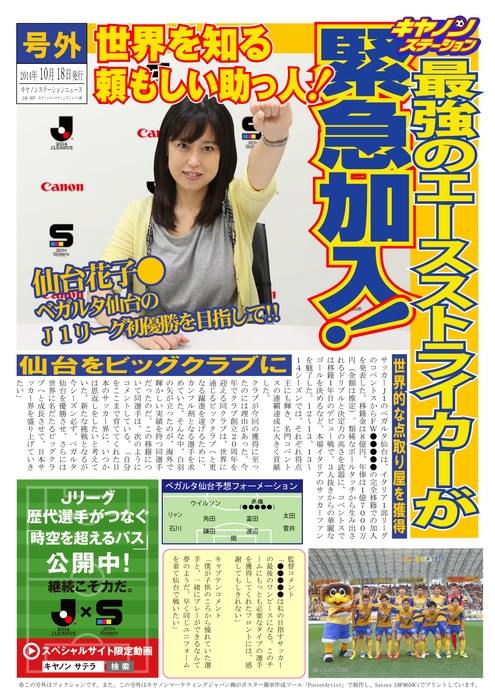 キヤノンマーケティングジャパン株式会社(社長:川崎正己)は、10月18日(土)にユアテックスタジアム仙台において、サポーター参加型イベント「キヤノンステーション2014 inユアテックスタジアム仙台」を開催します。来場者がベガルタ仙台の新加入選手となって記者会見を行った設定でオリジナルの号外を作成し、印刷したものをその場で持ち帰ることができます。