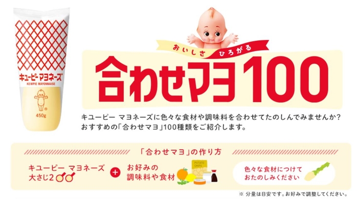 さらに、調味料や食材を合わせてつくる100種類の「合わせマヨ」の特設サイトを開設しました。他の調味料と合わせれば味わいも広がります。