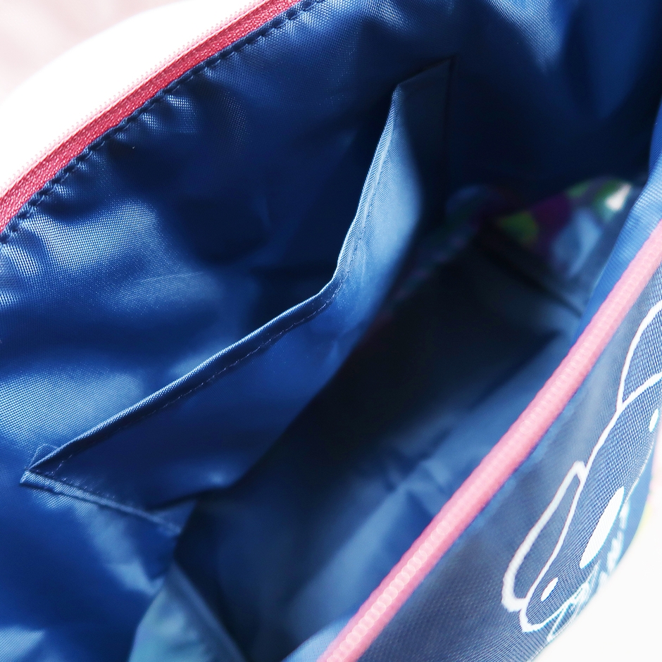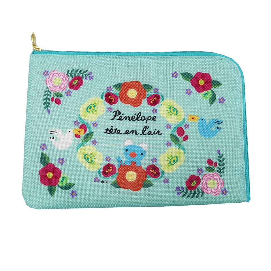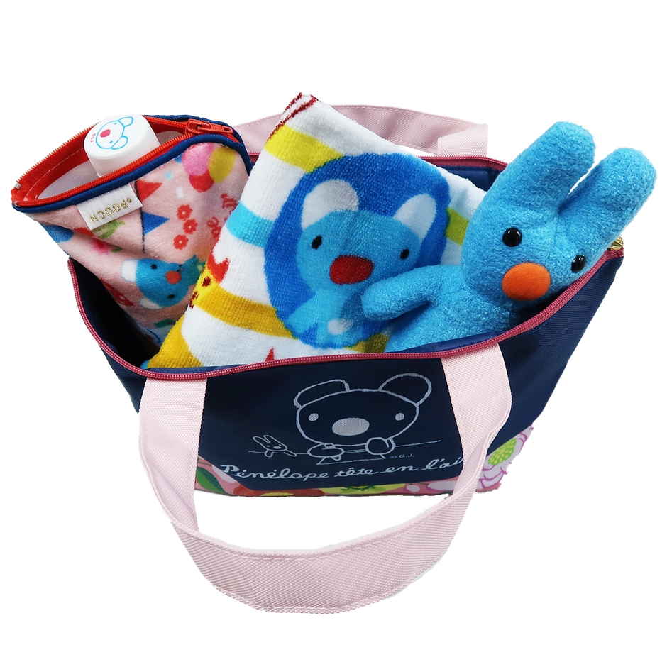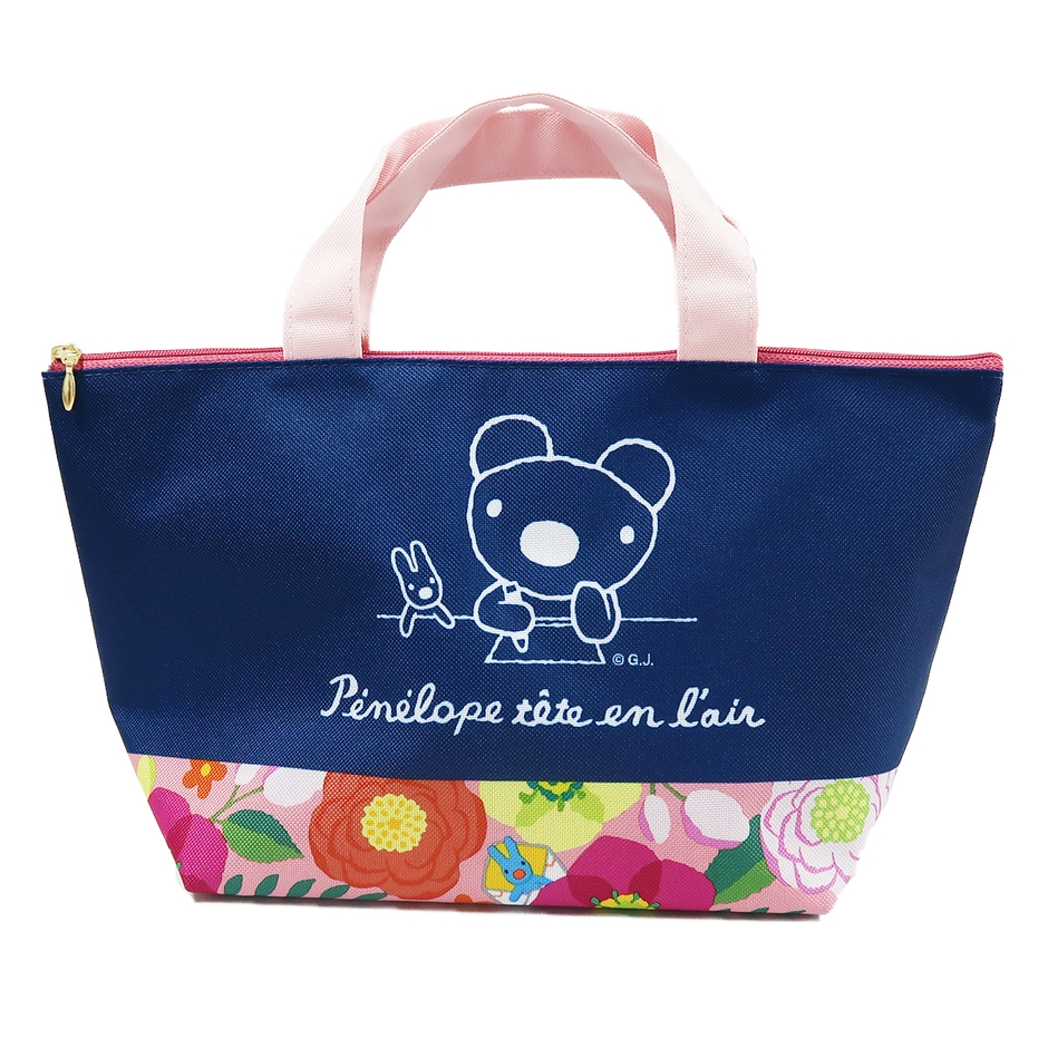 年代を問わず持ちやすい、ネイビーとフラワーモチーフを組み合わせた「ファスナー付きトート」です。上部にチャックがついているため中身を見られる心配がなく、毎日のお弁当やちょっとしたおでかけの際にぴったり。よく見るとフラワーモチーフの中には、「ペネロペ」のお気に入りのぬいぐるみ「ドゥドゥ」も隠れていますので、見つけてみて下さいね。