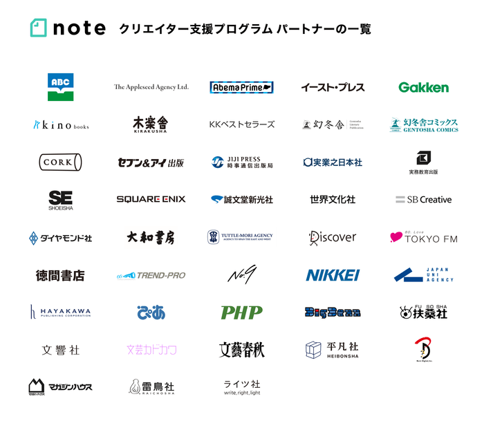note クリエイターが活躍する場を広げるために、ピースオブケイクがパートナーとともに才能の開花を後押しするプログラムです。現在43のメディアパートナーに参加いただいています。