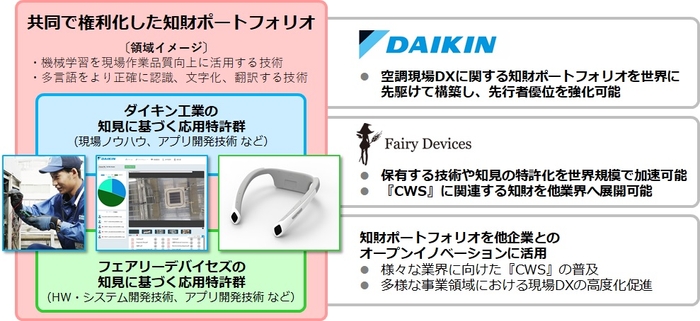 ダイキン工業株式会社(本社:大阪府大阪市、代表取締役社長 兼 CEO:十河政則、以下「ダイキン工業」)とフェアリーデバイセズ株式会社(本社:東京都文京区、代表取締役:藤野真人、以下「フェアリーデバイセズ」)は、両社が取り組む空調の現場に適した『Connected Worker Solution🄬※1(コネクテッドワーカーソリューション、以下「CWS」)』の開発・改善や空調の現場業務への実装に関わる技術領域において、グローバルな知財ポートフォリオの構築・拡充の取り組みを開始します。