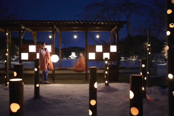 約22万坪の敷地をもつ青森屋には、伝統工芸品を使用した「あおもり藍テラス」や「八幡馬(やわたうま)ラウンジ」、茅葺屋根の古民家、足湯が点在する公園があり、滞在中の散策をおすすめしています。寒い屋外に出掛けることをためらう方にも冬の公園散策を楽しんでほしく、通常は夏にしか見られない色鮮やかなねぶたを、真っ白い雪景色の中で展示します。