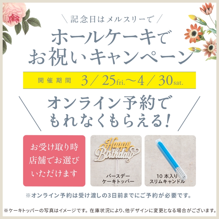 3月25日〜4月30日の期間中にオンラインからホールケーキをご予約いただいた方に、お渡しの際に特別なバースデーケーキトッパー(もしくは10本入りスリムキャンドル)をプレゼントいたします。