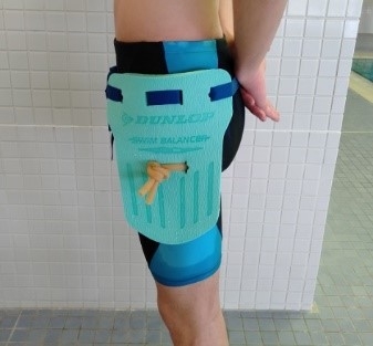 ・一般的な市販品の水泳用ヘルパーと異なり、泳ぎの邪魔にならない体の側面に装着できる水泳練習用具です。