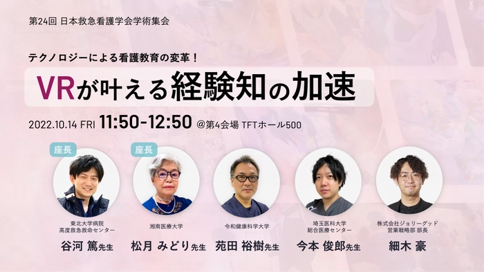 株式会社ジョリーグッド(東京都中央区、代表取締役:上路健介、以下 ジョリーグッド)は、2022年10月14日(金)〜15日(土)に開催される第24回日本救急看護学会学術集会にて、VRゴーグル100台同時接続の大規模医療VRセミナーを実施いたします。看護領域にてVR100台同時接続のセミナー開催は日本初となります。