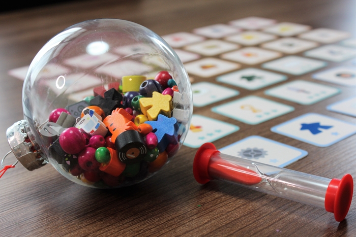 また、子どもの目をひき、目と音で楽しめるように、かつインテリアにもできそうなデザインを目指しています。探す時の音も軽快なしゃかしゃか音になるように、中身のトークンはすべて木製にこだわって揃えています。