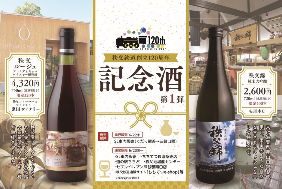 秩父鉄道株式会社(本社:埼玉県熊谷市、代表取締役社長:大谷 隆男)および株式会社矢尾本店(本社:埼玉県秩父市、代表取締役社長:矢尾 琢也)・株式会社秩父ファーマーズファクトリー(代表取締役:深田 和彦)では、秩父鉄道創立120周年を記念した特別仕様の日本酒・ワインを6月22日(土)に先行販売、23日(日)から通常販売いたします。先行販売となる6月22日(土)は、「SL秩父鉄道創立120周年記念酒号」を運転し、くだり車内で試飲・販売を行います。詳細は、下記のとおりです。