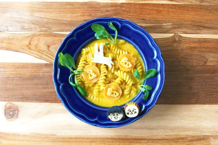 お月さま色のクリームパスタ。さつまいもの角切り、チキン、かぼちゃとにんじんのクリームポタージュ。
