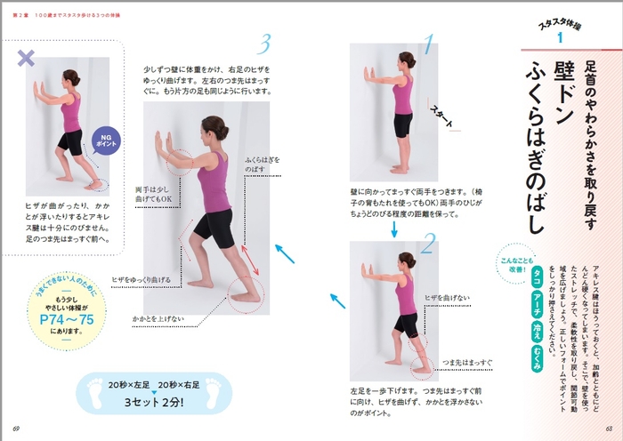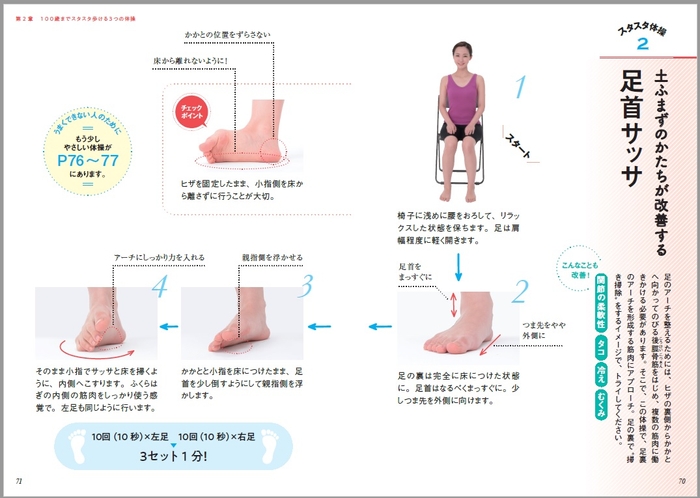 名前のとおり、「いつまでもスタスタ歩ける足を作る」ための体操で1日約5分、朝に実践すると効果的です。歩くのに必要な筋力や柔軟性を最小限の動きで保てるように工夫されています。菊池院長が執筆した『足の専門医が教える 100歳までスタスタ歩ける足のつくり方』(アスコム)より、スタスタ体操のやり方を抜粋しましたので、以下ご参照ください。