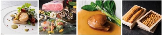 蝦夷鮑をはじめとした貝や数種類の海の幸を使用した色彩豊かなフランス料理や、大きな活鮑は、ビーフステーキとともに鉄板焼で、他にもシンプルに雲丹本来の甘味を味わうお寿司、オイスターソースを纏った干し黒鮑の濃厚な風味のひと品をご用意。胸をふるわせる感動的な美食体験とおもてなしにご期待ください。