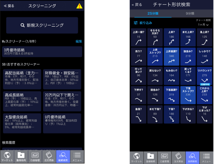 銘柄スクリーニング機能では、PERなどの財務情報やテクニカル指標などの条件で銘柄を検索することが可能です。チャート形状検索機能では、チャートの形状により25パターンまたは9パターンで銘柄を検索することが可能です。