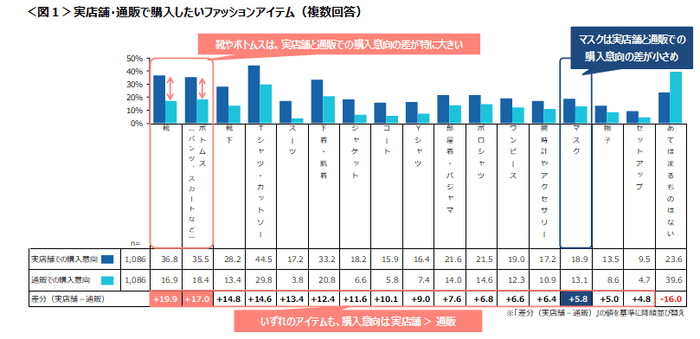「靴」や「ボトムス」は実店舗志向が強め。「マスク」は通販での購入意向も一定数みられる。