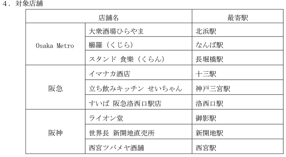 大阪市高速電気軌道(Osaka Metro)と阪急電鉄、阪神電気鉄道の3社は、2019年5月27日(月)から7月12日(金)まで、各沿線の立ち飲み居酒屋を巡っていただく共同企画を実施いたします。この企画は、おすすめのお店をご紹介したパンフレット「立ち飲みBOOK 2019」を駅で配布し、掲載店舗を訪問のうえ、ご応募いただくと抽選で素敵な賞品をプレゼントいたします。