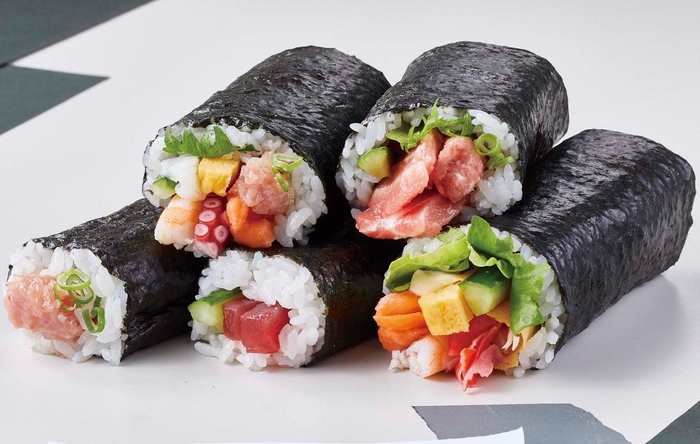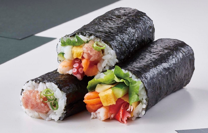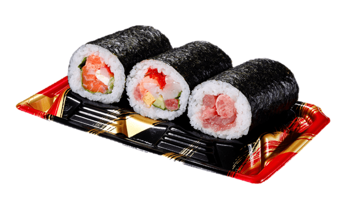 北海道産帆立入り海鮮太巻・まぐろたっぷり太巻・生サーモンとチーズ入りサラダ太巻の3種類の味をお楽しみいただける欲張りなハーフセット。