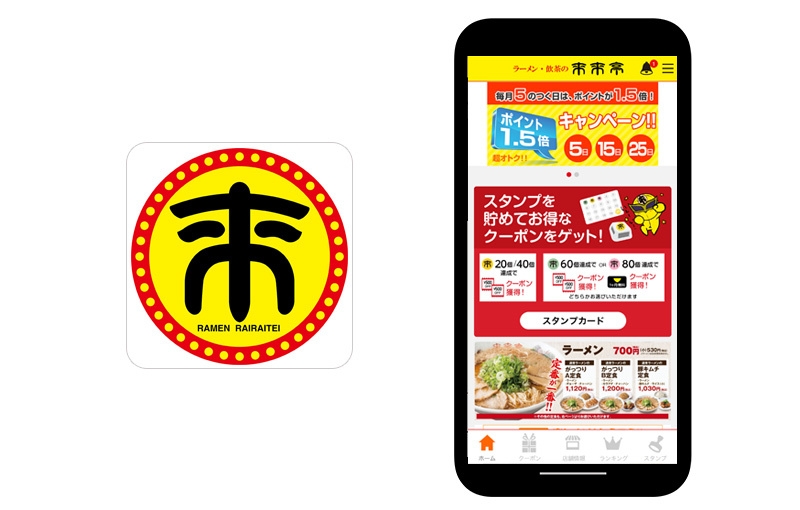 図1 『来来亭公式アプリ』 アイコンとトップ画面