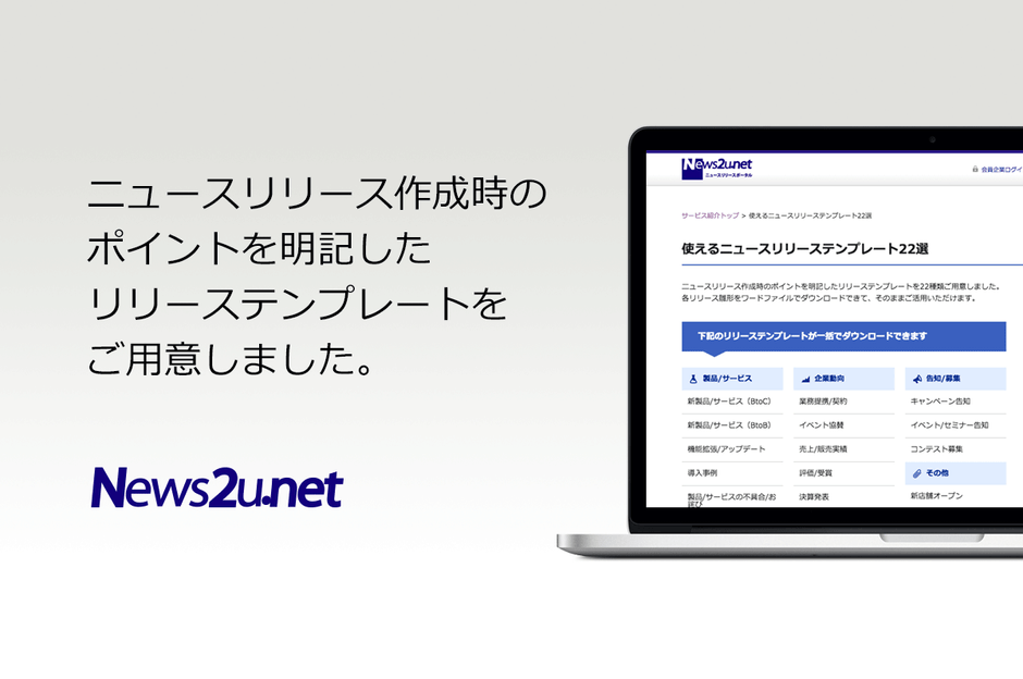 ネットPR事業を展開している株式会社ニューズ・ツー・ユー(東京都千代田区、代表取締役社長:増田彰)は、新人広報担当者様からWeb・マーケティング担当者まで情報発信を行なう方に向けた、リリース作成時のポイント付き「ニュースリリーステンプレート(22種類)」を公開しました。リリース雛形はワードファイルで無料ダウンロードできて、そのままご活用いただけます。