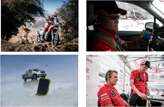 「Monster Energy Honda Team」は6年目の挑戦をケビン・ベナバイズ選手がファイナルステージで優勝、総合2位の成績で締めくくりました。「TORQUE(R) G03」はレースの舞台となった南米の砂漠、ジャングルや山岳地帯の過酷な環境下でのチームのコミュニケーションツールとして活用されたほか、レースマシンのログ情報、センサーを通じたエンジンの回転数や冷却温度等の情報をBluetooth (R)経由で収集し、チーム本部と共有。本部では収集された各種データの分析を行い、マシンの状態管理とチームの戦略構築に活用されました。また、バイタル測定デバイスから抽出した、ライダーおよびサポートメンバーの様々なデータ(心拍、呼吸数、血中酸素濃度など)を「TORQUE(R) G03」に集約し、チーム全員の体調管理ツールとしても活用されました。京セラの高耐久スマートフォン「TORQUE(R)」は、さらなる進化を追求して参ります。