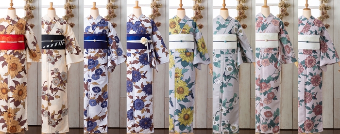 今年の新作浴衣のテーマは「花鳥柄」。長年にわたり京友禅などを手掛けてきた京都の図案屋の、熟練の職人による手描きデザインを起用した。京友禅のデザインの特徴は草花や動物を絵画的に描いている点。今季浴衣も、昨年に引き続きトレンドとなっているくすみ色の地色に、絵画的な花鳥を描いた4柄2配色の8種類となっている。