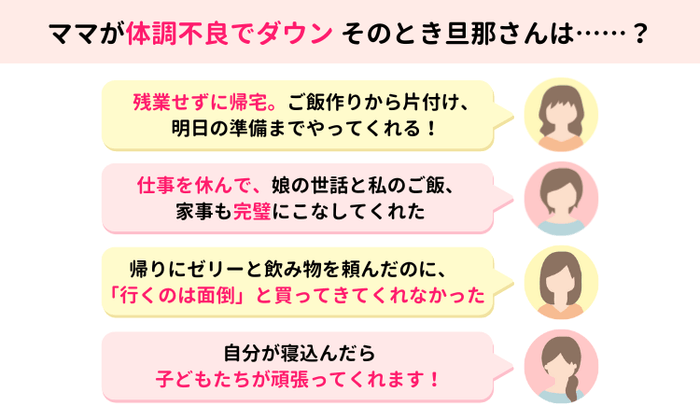 今回のアンケート結果では、ママが寝込んでも74%の家庭で旦那さんの協力が得られることがわかりました。一方で、「子どもたちが食べられないものを買ってきた」「私の指示がなければ動けない」といった声も聞かれます。体調不良のときに家族で助け合うためには、平常時から家族みんなで家事を行う必要があるといえます。