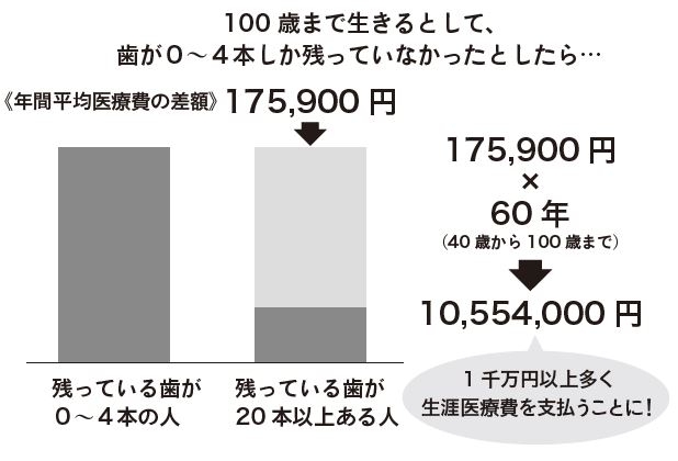 もしあなたが100歳まで生きるとして、そのとき歯が0~4本しか残っていないとしましょう。先ほどのデータをもとに、歯周病患者が増えはじめる40歳以上から100歳までの60年間分の医科医療費の差額を計算すると、年間平均医療費17万5900円×60年=1千55万4000円となります。つまり、残りの歯が20本以上ある人に比べて、1千万円以上も多く生涯医療費を支払わなければいけないことになるのです。もしこの1千万円を支払わずに済めば、老後のお金の不安はずいぶん減るのではないでしょうか。