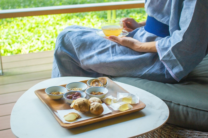 免疫向上食材として知られる「生姜」は、withコロナ時代にフィットした食材です。身体を温め、深呼吸しやすい身体へと導いてくれることから、生姜を使ったひと口サイズの寒天ゼリーと2種の生姜湯を用意しました。ピリリとした風味を楽しみながら、おいしく、気軽に摂り入れることができ、ウォーキングや入浴法の効果を高めてくれます。