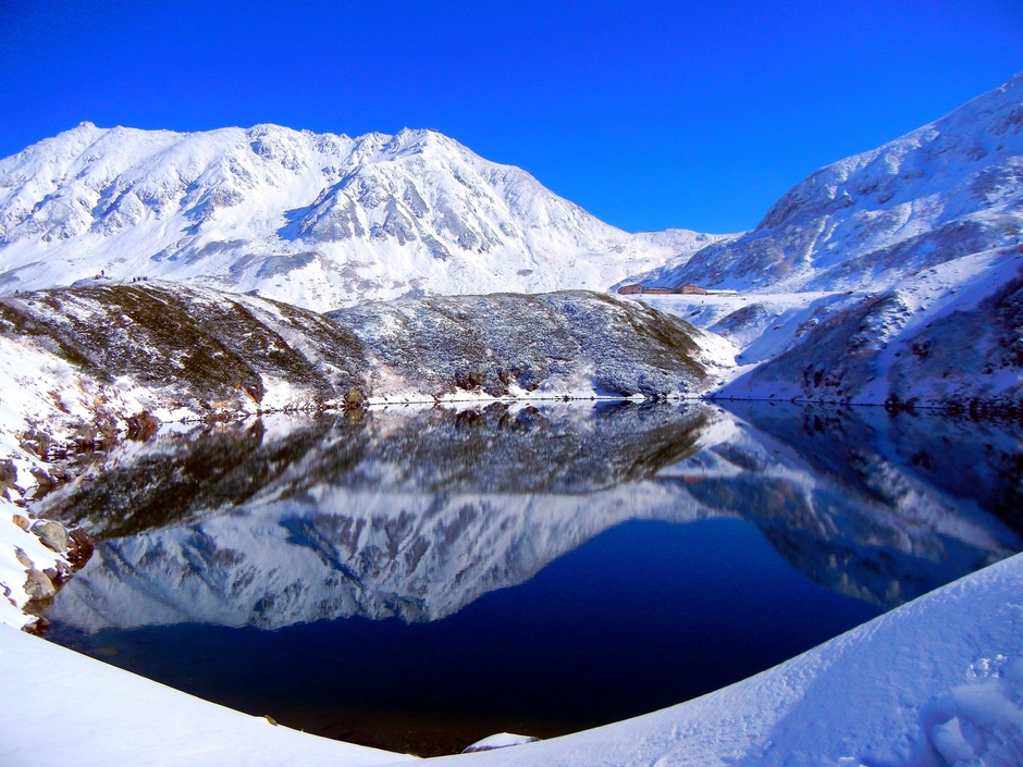 室堂平・みくりが池の湖面に鮮やかに映える、新雪の立山