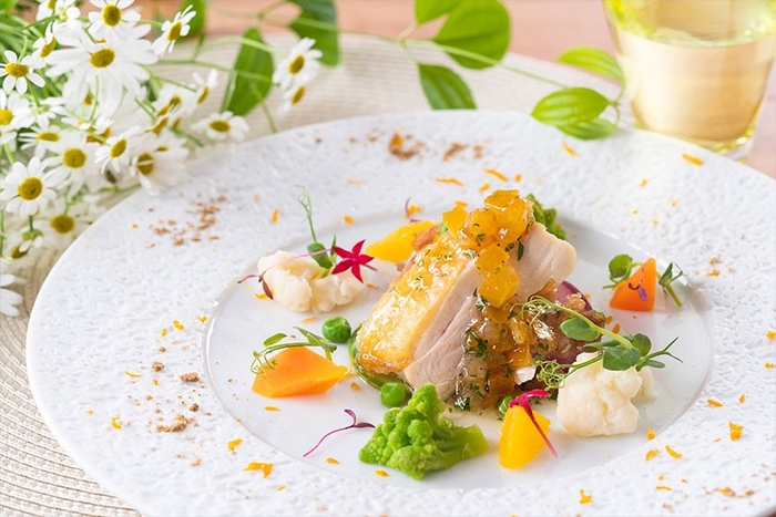 左)飼料にハーブを配合し、雄大な自然のもとで飼育された千葉県のブランド鶏「房総ハーブ鶏」のロースト。ジンジャーマスタードソースでお召し上がりください。