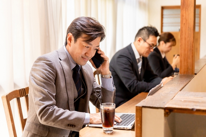 平日の日中からほとんどの席が埋まっています。営業マンが喫茶店でさぼってる光景は昔からよく見ましたが、ここはそうではないんです。
