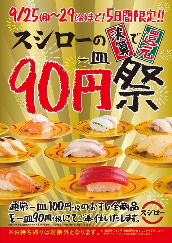 株式会社あきんどスシロー(本社:大阪府吹田市、代表取締役社長CEO:水留 浩一)は、決算期を迎えるにあたり、9月25日(月)~29日(金)の5日間限定にて『90円祭』を開催いたします。