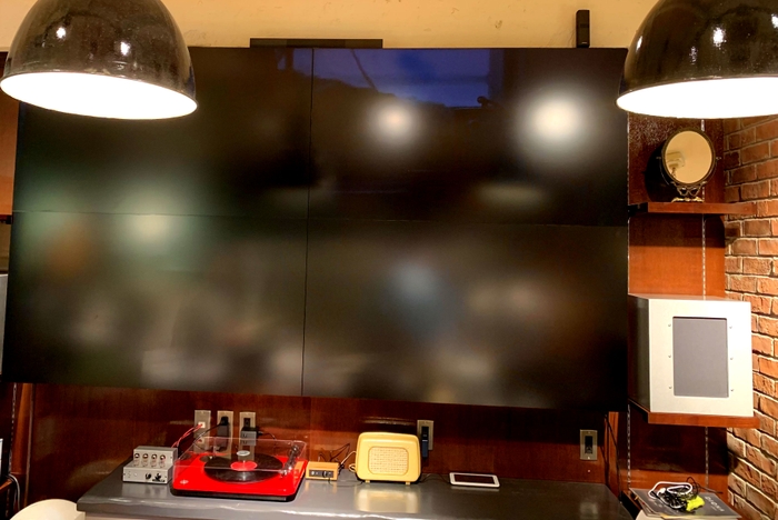 スピーカー・ケーブルも同社のものを採用し、オープン前の工事では、同社代表の荒川氏自らセッティングを施すなど、こだわりの環境を実現しました。店内カウンターの奥には、メガネ作製シーンなどを紹介した映像の流れる大型モニターも設置し、オーディオマニアも納得の空間をしつらえました。