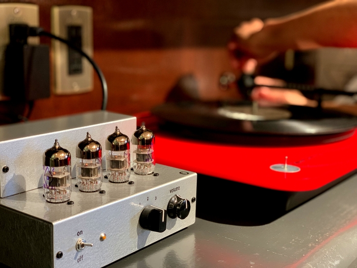 店内のBGMはアナログレコードの懐かしい音が響く。音響にもこだわったDIGNA HOUSEでは、真空管アンプを採用。この真空管アンプは東京・上野のオーディオクラフトショップ「オーディオみじんこ」代表の荒川敬氏の手がけた手作りの逸品。今では絶版になってしまった真空管「6N3」を用い、アナログレコードの魅力を最大限に引き出します。