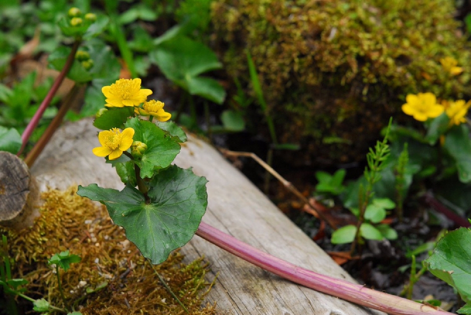北海道~本州の山地の湿地や渓流沿いに群落をつくる多年草です。茎は直立せず50cmほども横に這って、その先に花をつけるのが特徴です。株を中心に四方に伸び広がる茎をサルの腕に見立てて「猿猴草」と書きます。