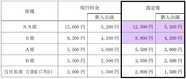 宝塚大劇場公演および東京宝塚劇場公演のSS席・S席の料金を改定します。