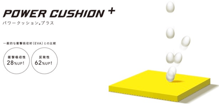 衝撃吸収性と反発性を併せ持つ「軽く、疲れにくい」衝撃吸収反発素材パワークッション。パワークッションに反発性の高い特殊樹脂を添加し、+型の溝を最適な間隔と深さで格子状に配置した新構造を採用した「パワークッションプラス」は、従来の軽量性を保ちつつ、衝撃吸収性を28%、反発性を62%アップさせ(一般的な衝撃吸収材[EVA]との比較)、12mの高さから落とした生卵が、割れずに6m以上跳ね返る新衝撃吸収反発素材です。