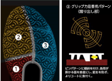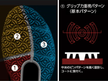 右図①(赤)は中央のピンパターンを他のピンパターンより高く設計し、コートに食付きやすくすることで、グリップ力を向上。
