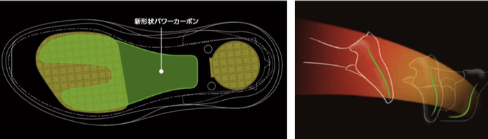 中足部から前足部の左右に伸ばした新形状の「パワーカーボンドライブ」(下図の黄緑部分)が中足部のねじれを防ぎ、安定性を図るとともに、屈曲時のソールの復元をアシスト。前足部とかかと部に搭載したパワークッションプラス(下図の黄色部分)との相乗効果で、次の一歩を踏み出す推進力を生み出します。