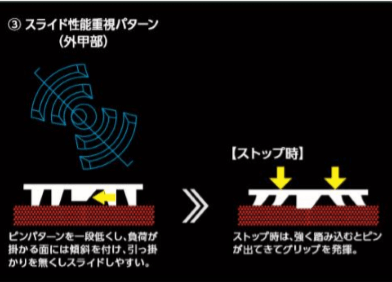 外甲部にあたる右上図③(青)は中央のピンパターンを他のピンパターンより一段低くし、スライドする際に負荷が掛かる面に傾斜を付けることで、摩擦の引っ掛かりをなくし、スライドを促進。