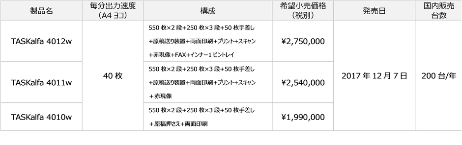 京セラドキュメントソリューションズジャパン株式会社(社長:薄田 敏行)は、京セラドキュメントソリューションズ株式会社(社長:伊奈 憲彦)製のモノクロA2対応複合機「TASKalfa 4012wシリーズ」3機種を12月7日より発売します。