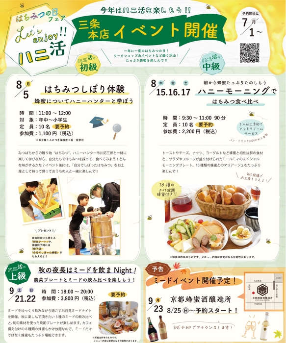 今年もミールミィ三条本店では蜂蜜を楽しめるイベントを開催いたします。「蜂蜜堪能モーニング」や毎年恒例の「はちみつしぼり体験」などの予約を受付中。お早めにご連絡ください。