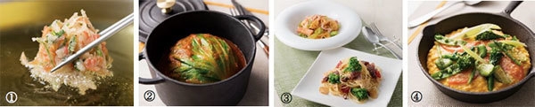 菜の花や桜海老を使ったパスタやオムレツ、ロールキャベツなどの新メニューが登場。目の前で揚げる「小海老のかき揚げ」もタイムサービスでお愉しみいただけます。そのほか、「鰆(サワラ)とタルタルソースのオーブン焼き」やアスパラを使ったサラダデリなどもビュッフェ台に並びます。