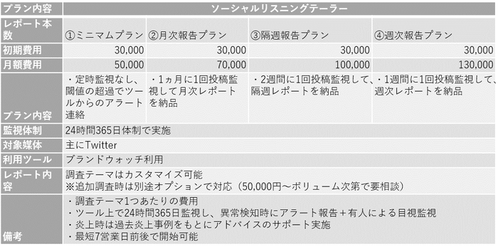 これを受け、BTPは、SNS運用や風評対策に知見のない企業向けに、ソーシャルリスニングや競合調査、炎上リスク対策・対応までをローコストで運用をサポートする「ソーシャルリスニングテーラー」の提供を開始いたします。
