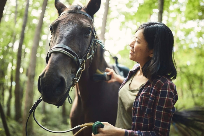 「馬と道草ピクニック」では、馬と一緒に森を楽しむ5つのアイテムを提供します。まずは、挨拶代わりの丁寧なブラッシングで馬とコミュニティを図ります。そして、馬に任せて森に出かけ、道端で見つけた道草を図鑑で調べたり双眼鏡でさえずる鳥を探したりと、森でゆったりとした時間を過ごします。