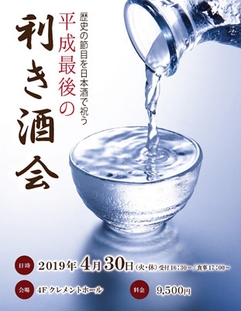 JRホテルクレメント徳島(徳島市寺島本町西1丁目61番 総支配人:井上 佳治((いのうえ よしはる))は、2019年4月30日(火・休)に「平成最後の利き酒会」を開催いたします。
