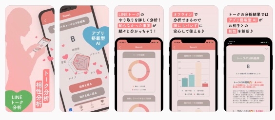 LINEトークを分析し、お互いのトーク数、スタンプの数、トークの時間帯傾向、よくトークする言葉・・・などのLINEのトークまとめ情報を見ることができます。