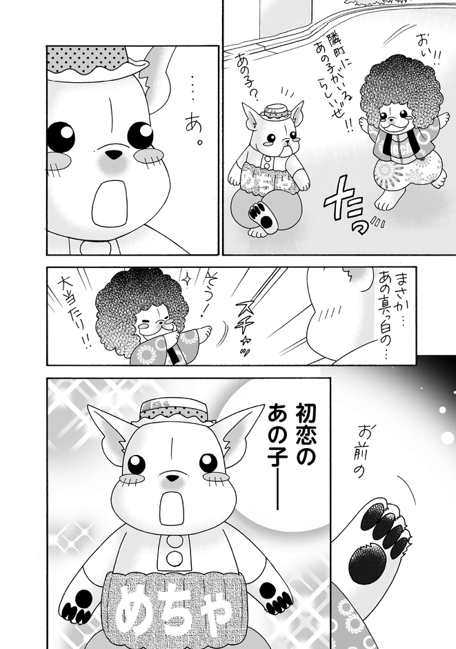 無料配信中のオリジナルコミック『めちゃ犬とことこ』、今回は「めちゃ犬と初恋」編です。隣町にめちゃ犬の初恋だった真っ白でフワフワのあの子がいるとアフロから聞いて、会いに行くことに!そこには…!?