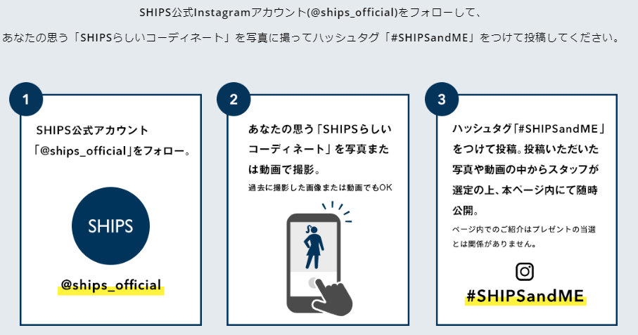 参加方法は簡単で、テーマ「あなたの思うSHIPSらしいコーディネート」に沿った写真と